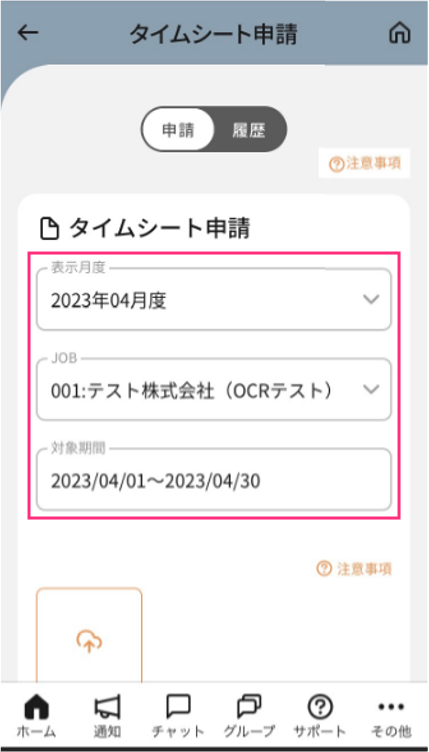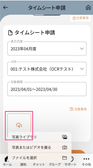 タイムシートの写真を撮る、もしくは選択し添付する